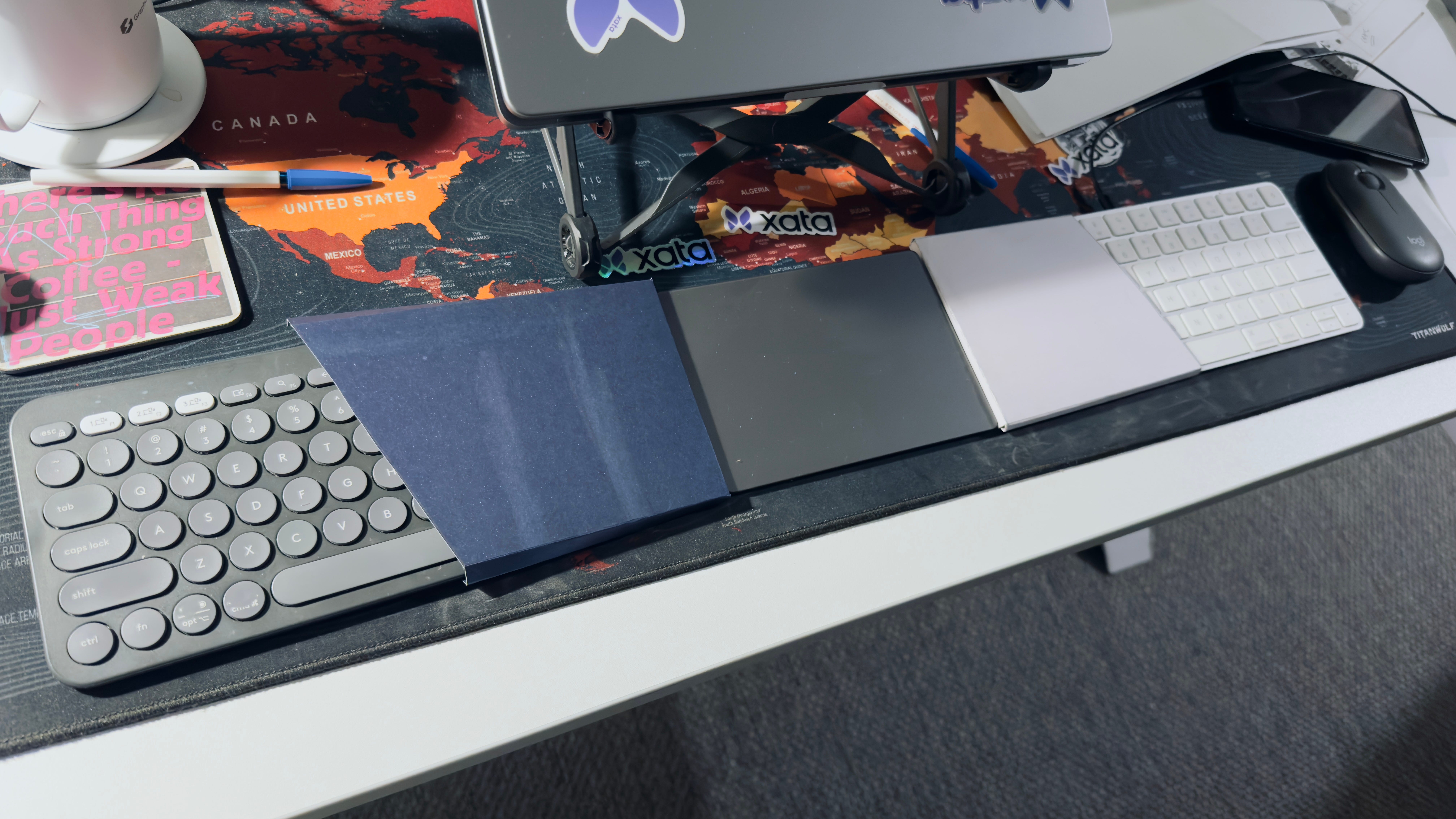 Validating the mechanical keyboard rabbit hole using thick paper, two Logitechs, and Karabiner-Elements.