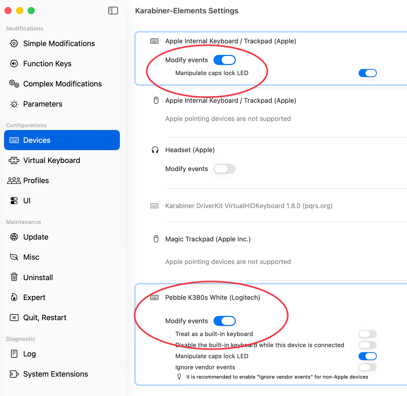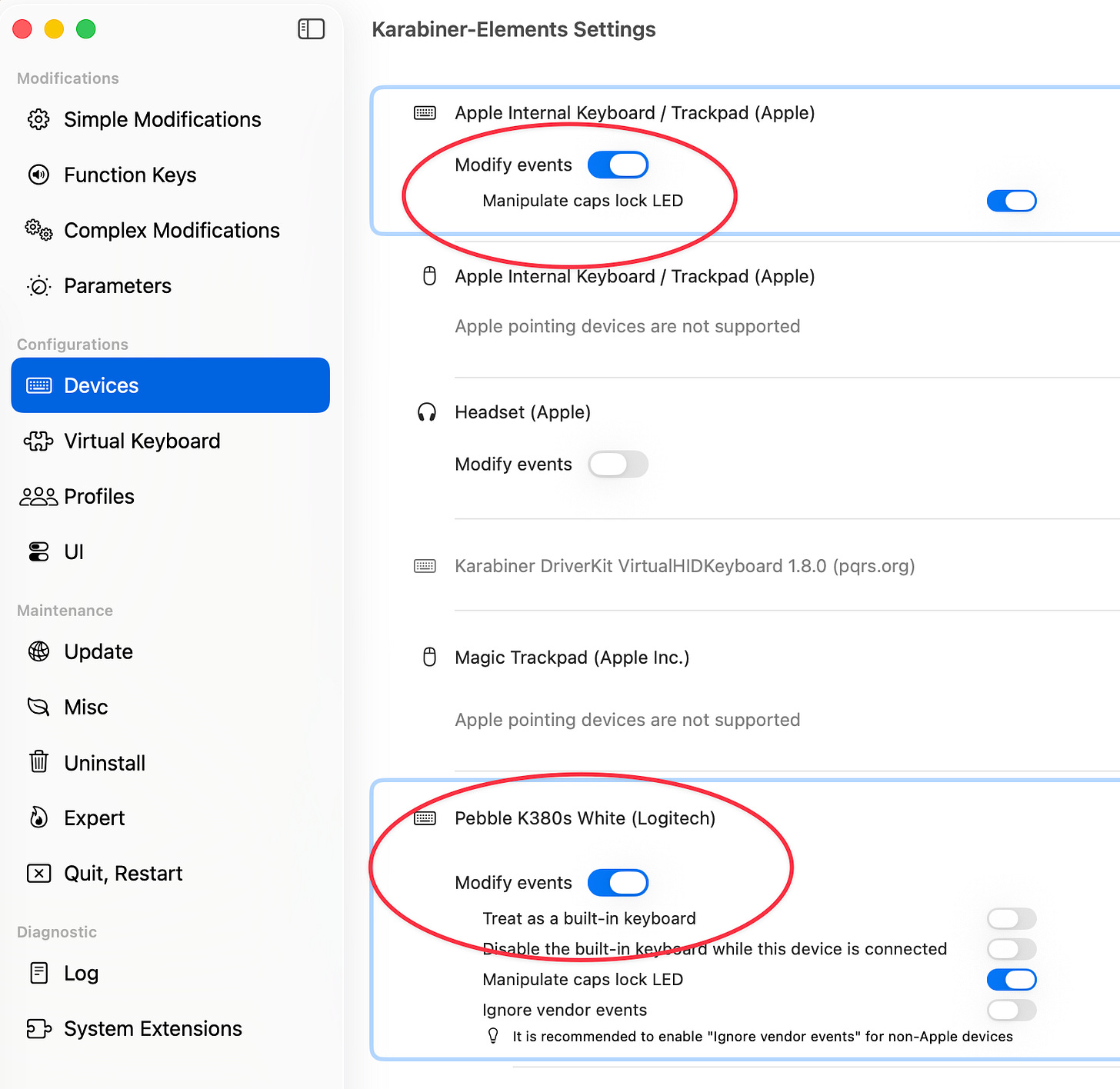 Luckily, there is a nice (almost turnkey) software solution to this. It is called Karabiner-Elements. It automatically detects all connected keyboards and other input devices and all I had to do was to toggle “Modify events” on. This was enough to share modifier key state between the two physical and completely separate keyboards.